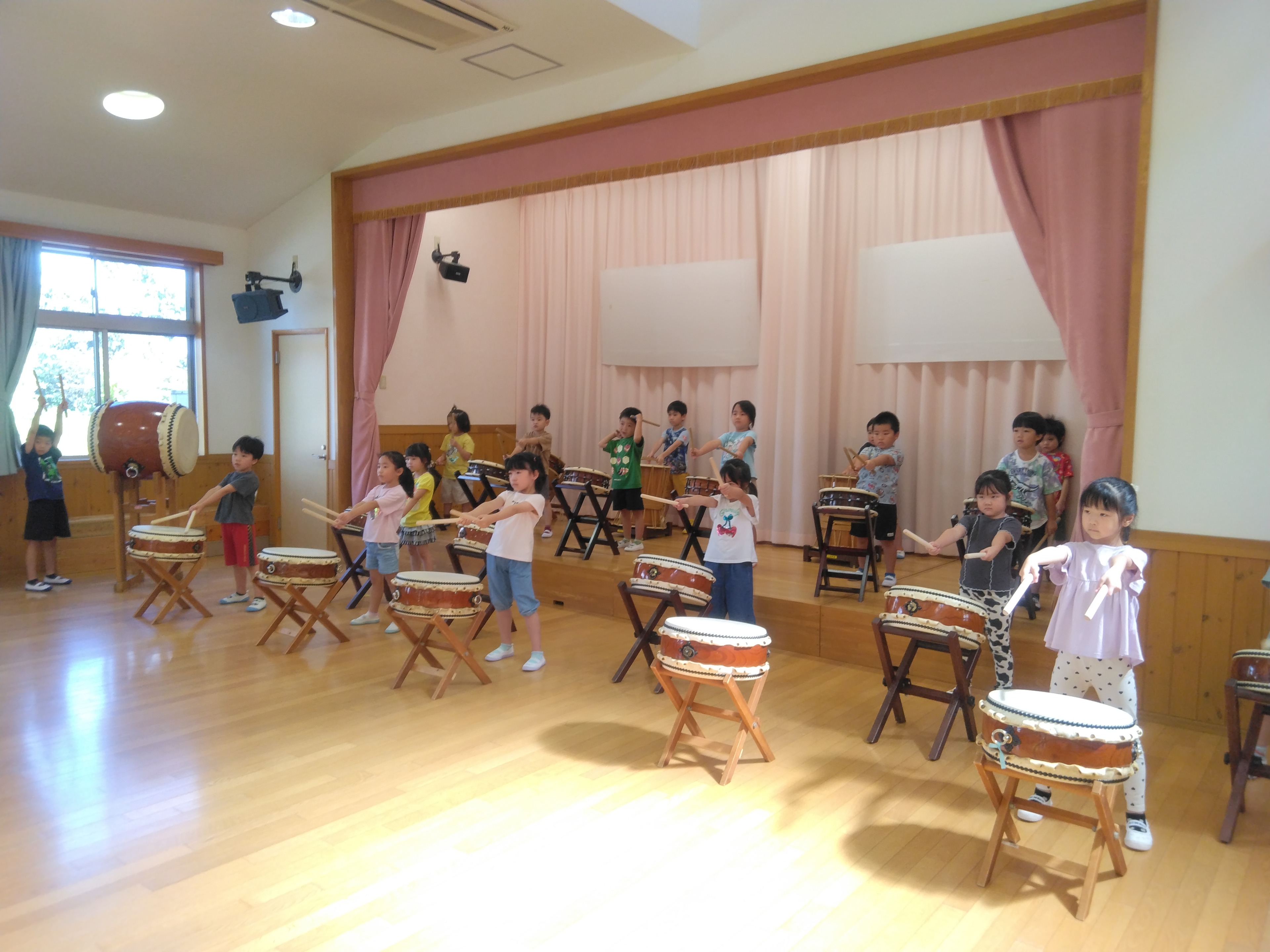 今日は和太鼓練習をしました。リズム打ちの練習や、腕を伸ばして構えるなど、生活発表会に向けて練習を進めています!様々なリズム打ちをかっこよく練習しているさくら組さんです!
