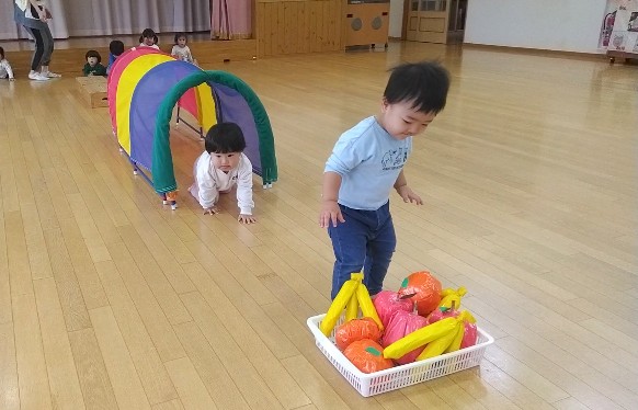 元気いっぱいに「えいえいおー!」と運動会の歌をみんなで歌いました。平均台とトンネルをくぐり、みんなが大好きなおさるさんに果物ぱくっ!と食べさせてゴール!楽しく体を動かしました!