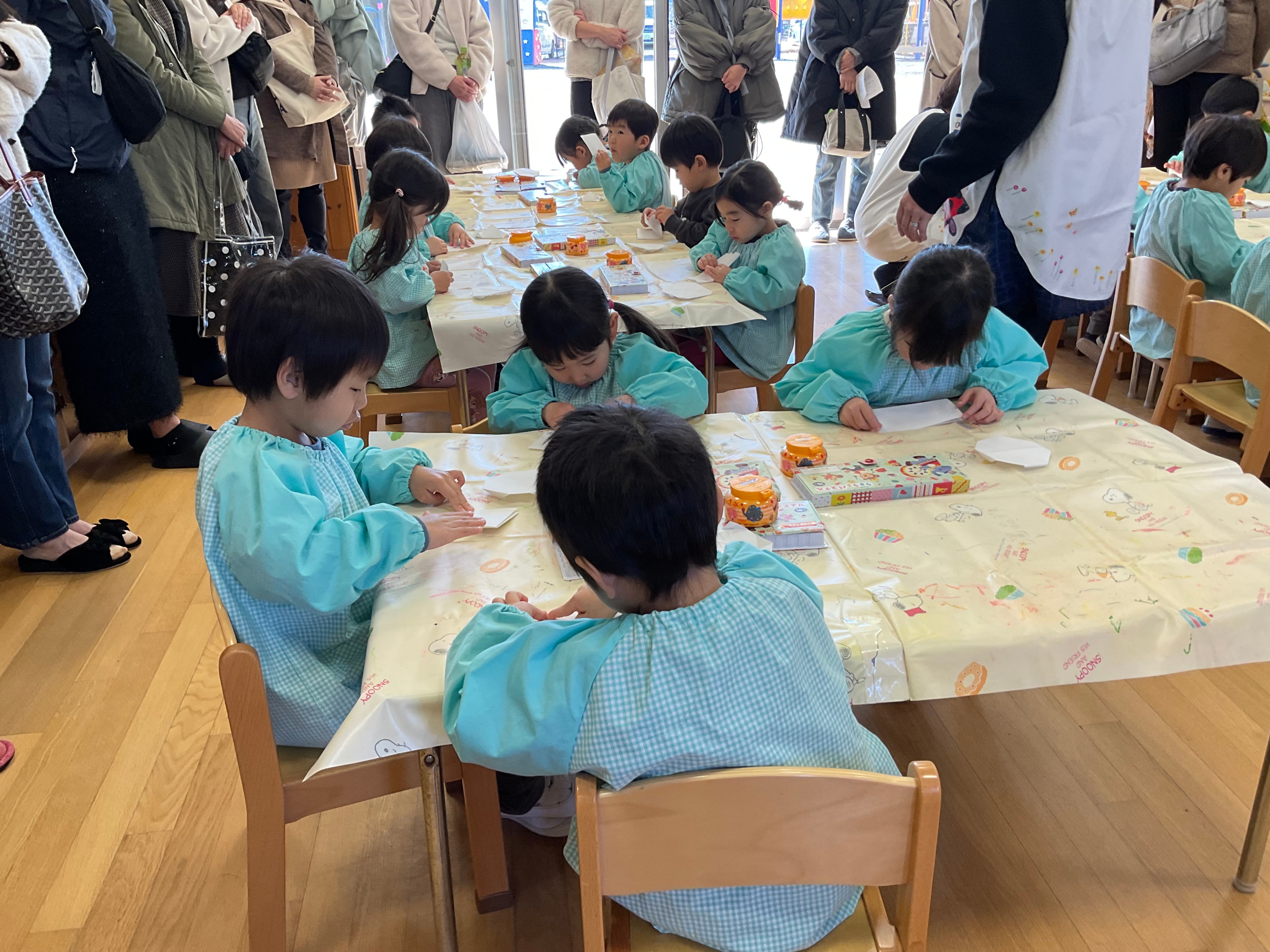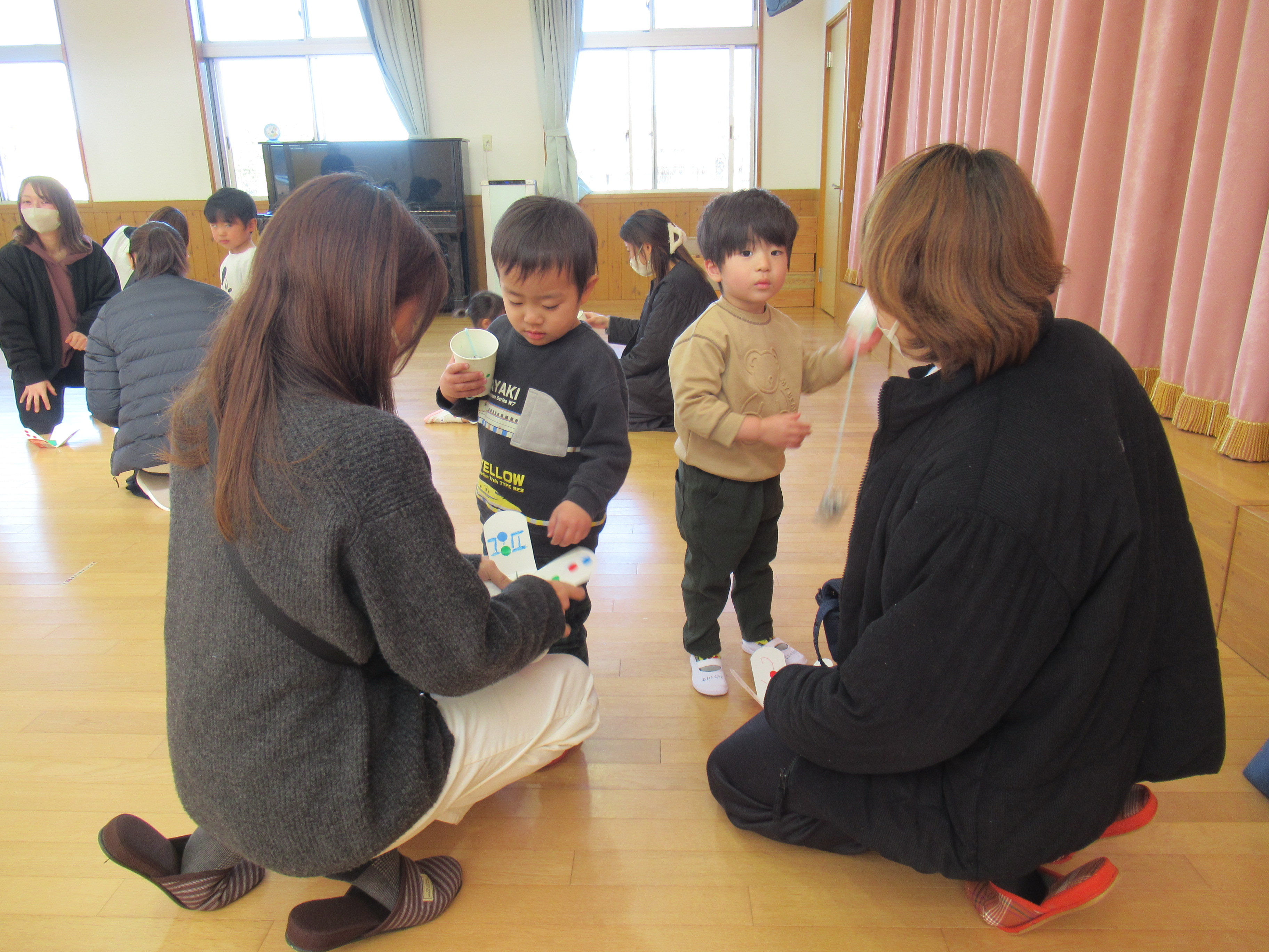 親子でコマとけん玉を作って遊びました。お父さんやお母さんと製作をして、一緒にコマ回しやけん玉をしたり、とっても嬉しそうでした。給食の様子も見ていただきました。