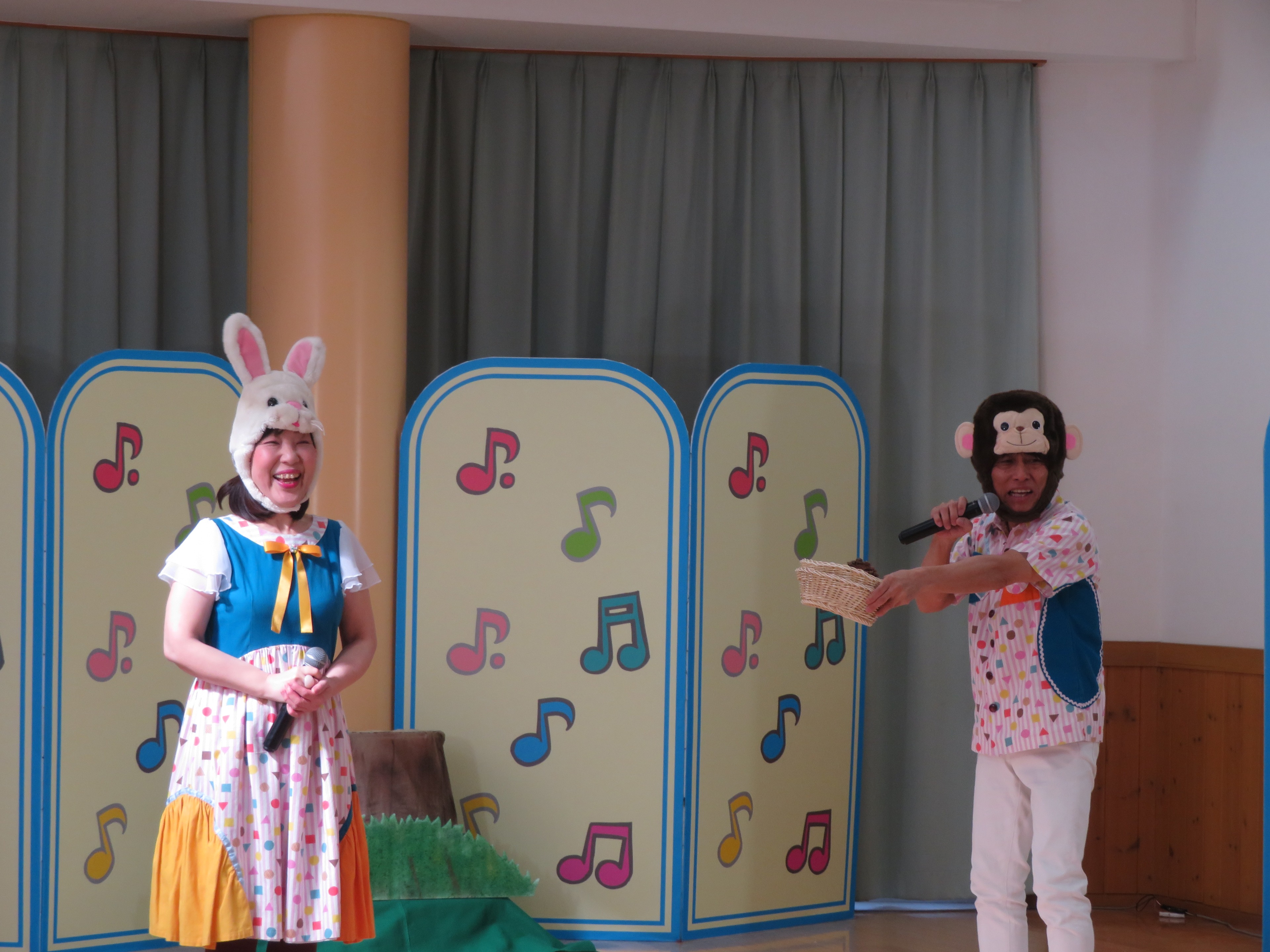 「まちのおんがくやさん」が来てくれました。いろいろな歌に合わせて踊ったり、子ども達も大喜びで参加していました。特に、魔法をかけて動物さんに変身したり、恐竜さんがでてきたり、楽しそうに見ていました。