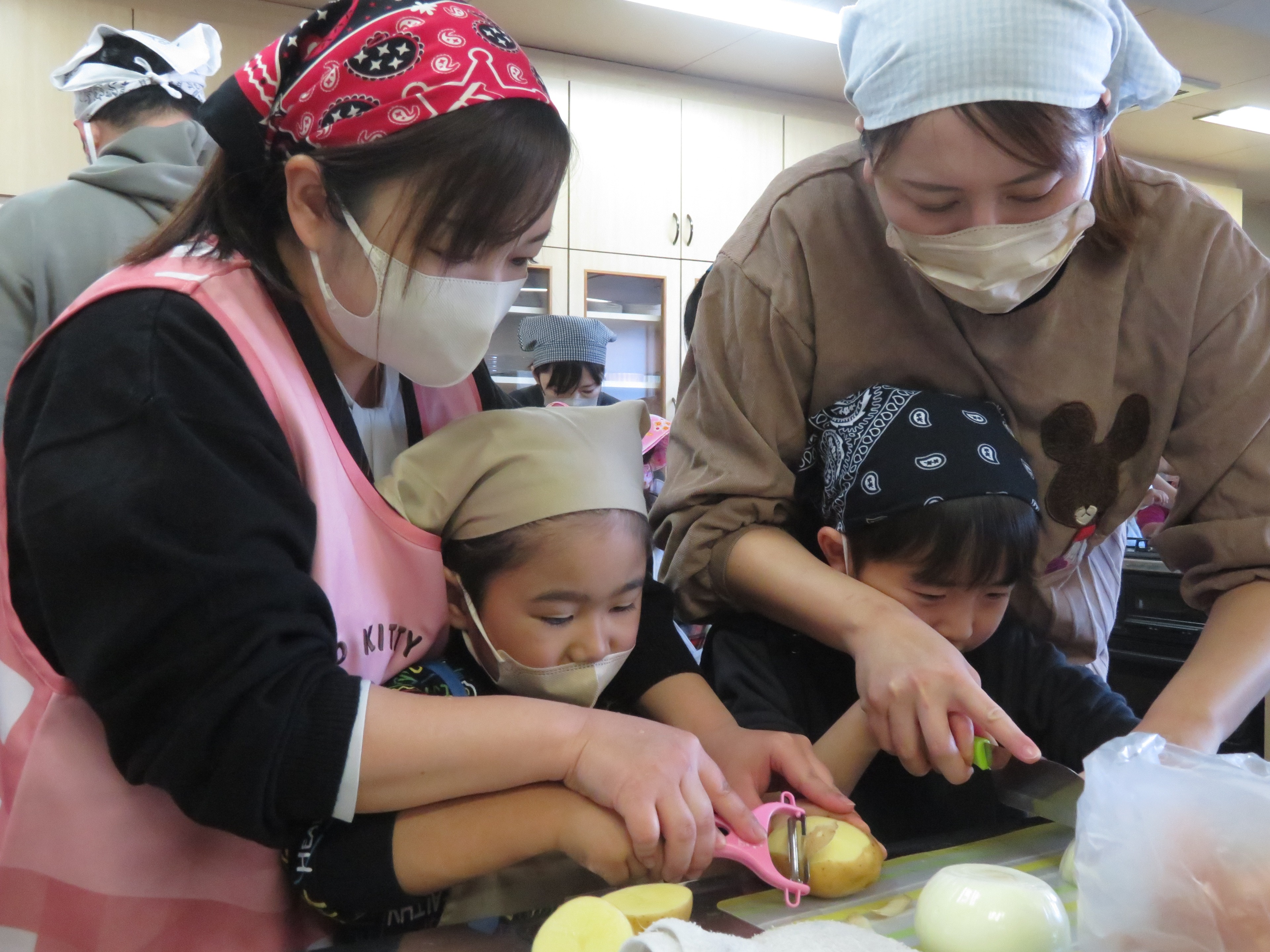 大宮コミュニティセンターで、食生活改善推進委員の方々に指導していただき、親子で料理をしました。野菜を切ったり、混ぜたり、楽しく作りました。