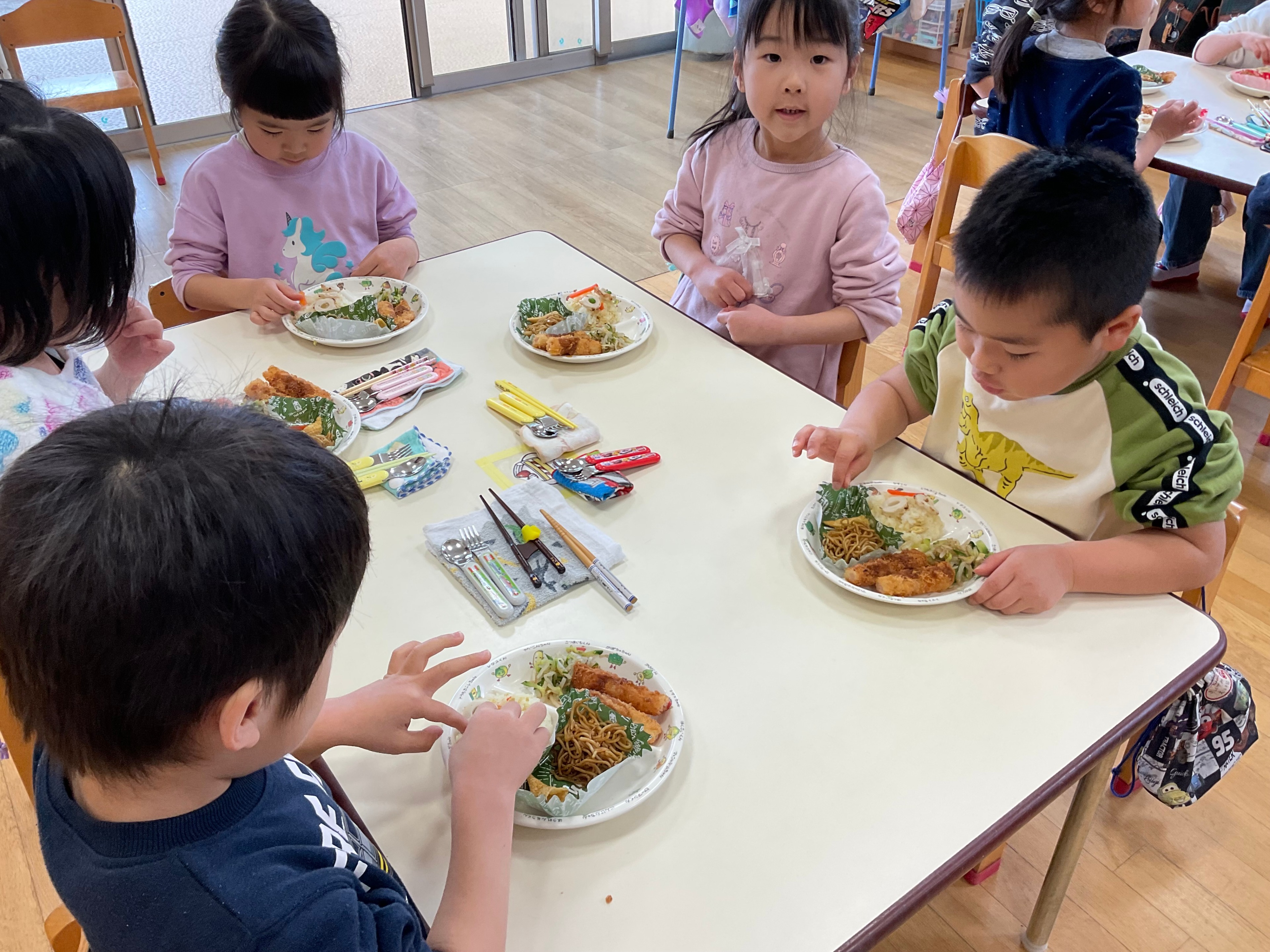 給食はなんと鬼のお顔!もも組とさくら組は自分たちで顔になるように、焼きそばの髪の毛や、ちくわの目を飾りつけしました!